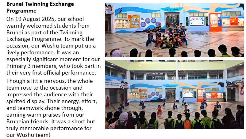 The purpose of our CCA is to engage and train students in the sport of Wushu to build their core strength, agility and mastery of the skill. To achieve this, weekly training is conducted for our members. For those who show more interest and flair in the sport, further training is provided during school team practices. These students also perform for the school on special occasions and represent us in competitions.