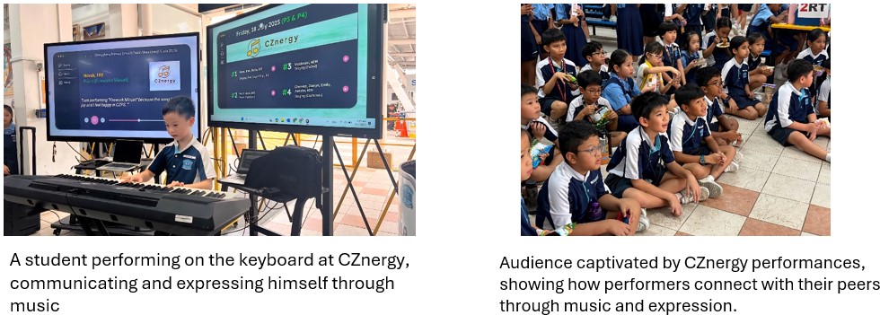 At Chongzheng Primary School, our Music curriculum nurtures every child’s innate musical potential through engaging and meaningful learning experiences. Guided by the musical processes of Listening, Creating, and Performing, students explore diverse genres and traditions while developing 21st Century Competencies. Our aim is for students to build strong musical skills and understanding of key concepts, while deepening their appreciation of Singapore’s rich cultural heritage and the wider world of music. Above all, we want them to express themselves with joy, creativity, and confidence through music.