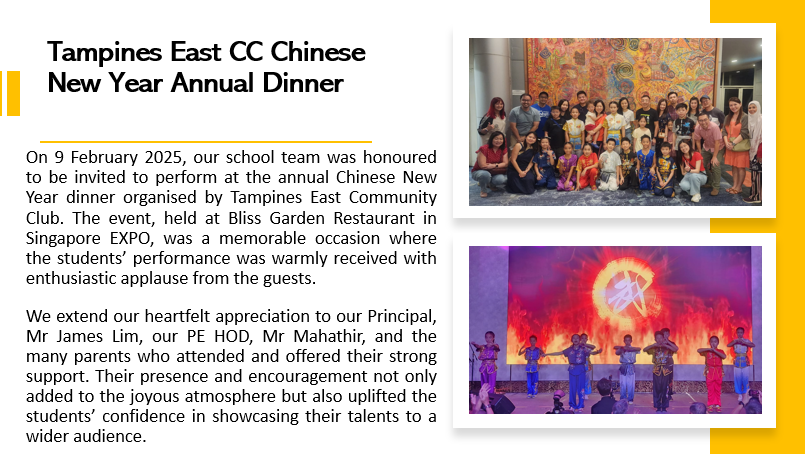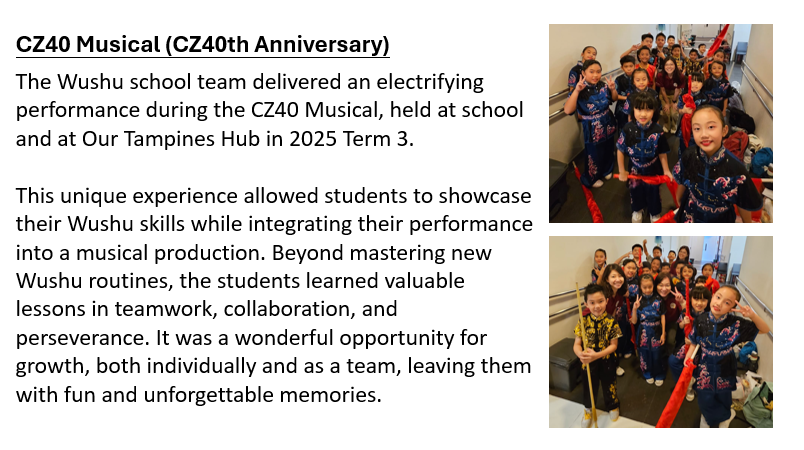 The purpose of our CCA is to engage and train students in the sport of Wushu to build their core strength, agility and mastery of the skill. To achieve this, weekly training is conducted for our members. For those who show more interest and flair in the sport, further training is provided during school team practices. These students also perform for the school on special occasions and represent us in competitions.