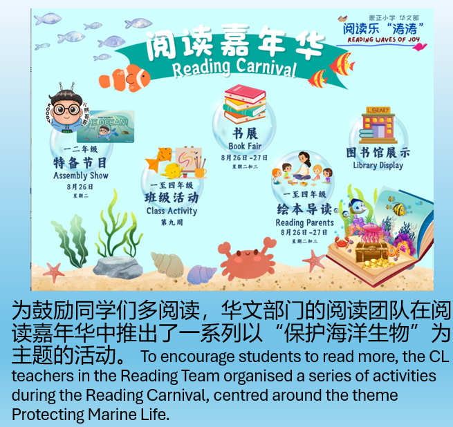 To extend the learning of Mother Tongue Languages beyond classroom, “Happy Ocean” was set up in the school in 2017. In this cozy area, pupils have the opportunity to interact with their peers using their Mother Tongue Languages through fun activities during recess. Under the supervision and guidance of our PaVE members and selected Mother Tongue Language student-leaders, pupils play various language games like Boggle, Word Dominoes and Chinese Chess.