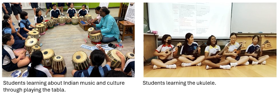 Our core instrumental programme centres on the Xylophone and Ukulele from Primary 3 onwards, providing both melodic and harmonic foundations. This is complemented by a variety of percussion and cultural instruments, including Chinese and Indian percussion and the angklung, connecting students to Singapore’s multicultural and global music landscape.