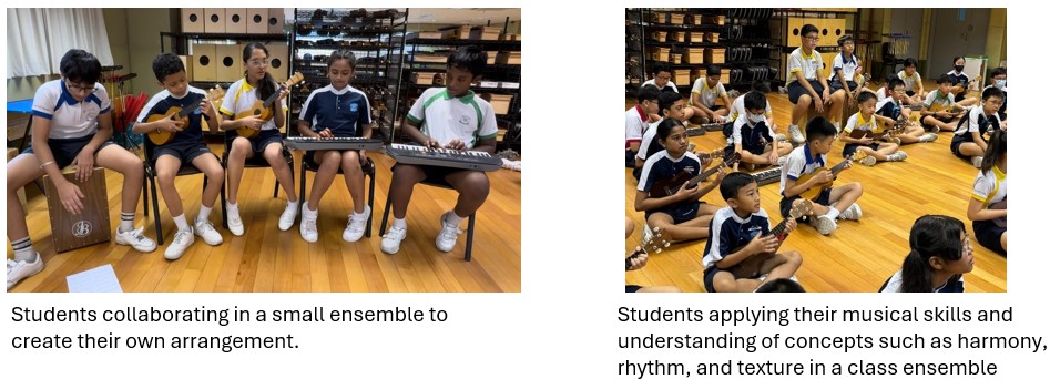 Students refine their skills through ensemble experiences, such as forming a pop band and angklung ensemble. They create their own arrangements, explore more complex musical skills and concepts, and grow in collaboration, global awareness, and civic literacy.